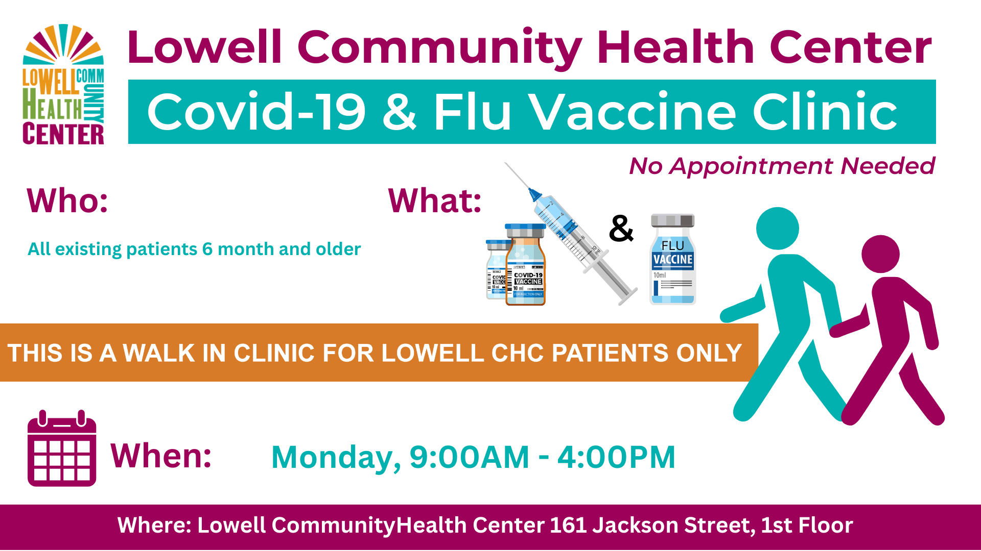• Where: Lowell Community Health Center, 1st Floor, 161 Jackson Street, Lowell, MA 01852