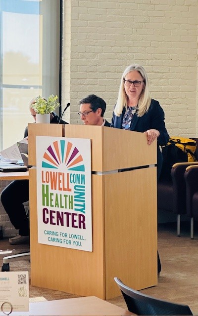 Susan West Levine, CEO of Lowell Community Health Center, speaking during the health center’s Match Day celebration.